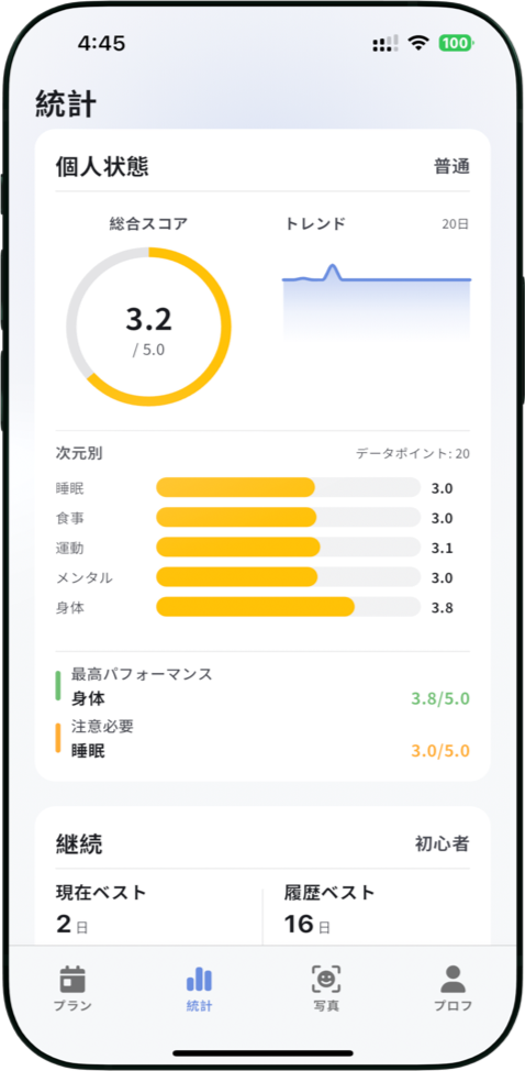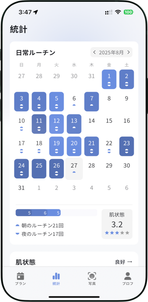 生活要因の記録で夜更かしが肌に与える影響がわかり、生活がより規則的になりました。