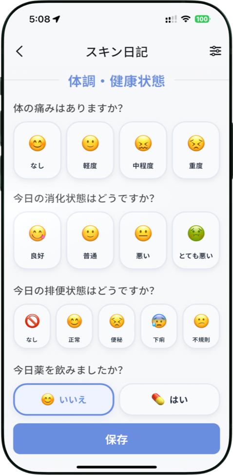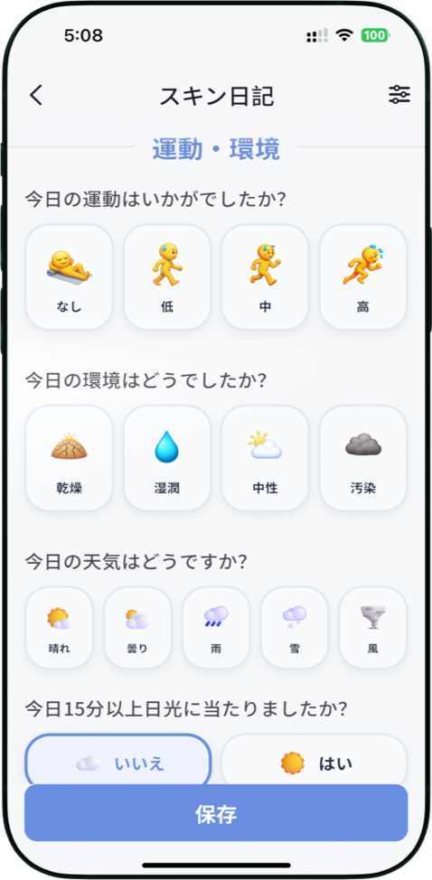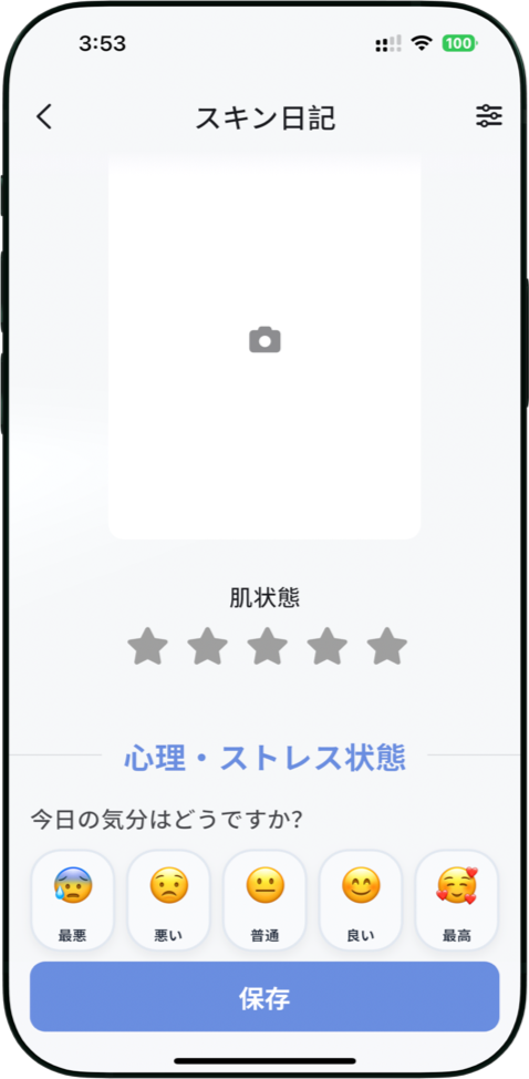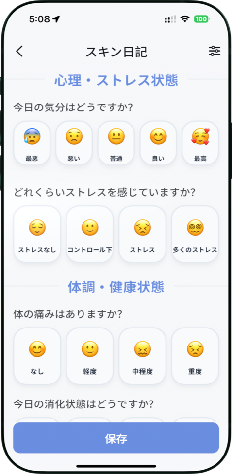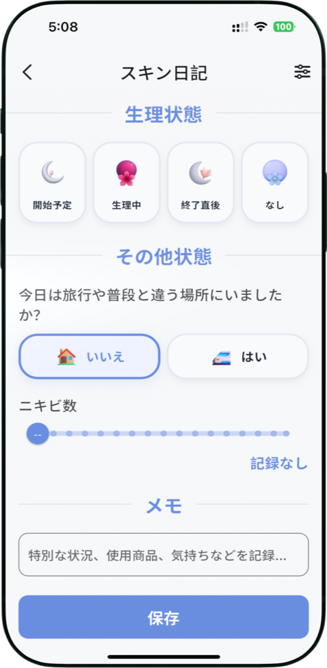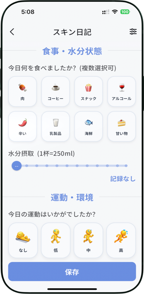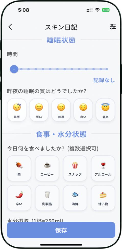 睡眠、食事、気分、生理周期など、肌に影響する生活要因を記録。